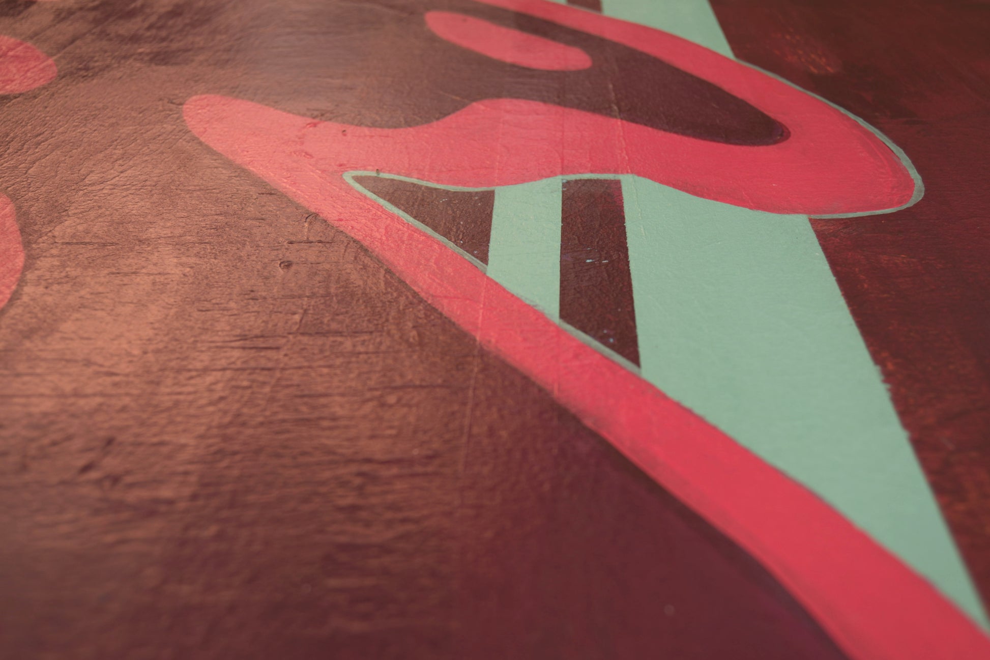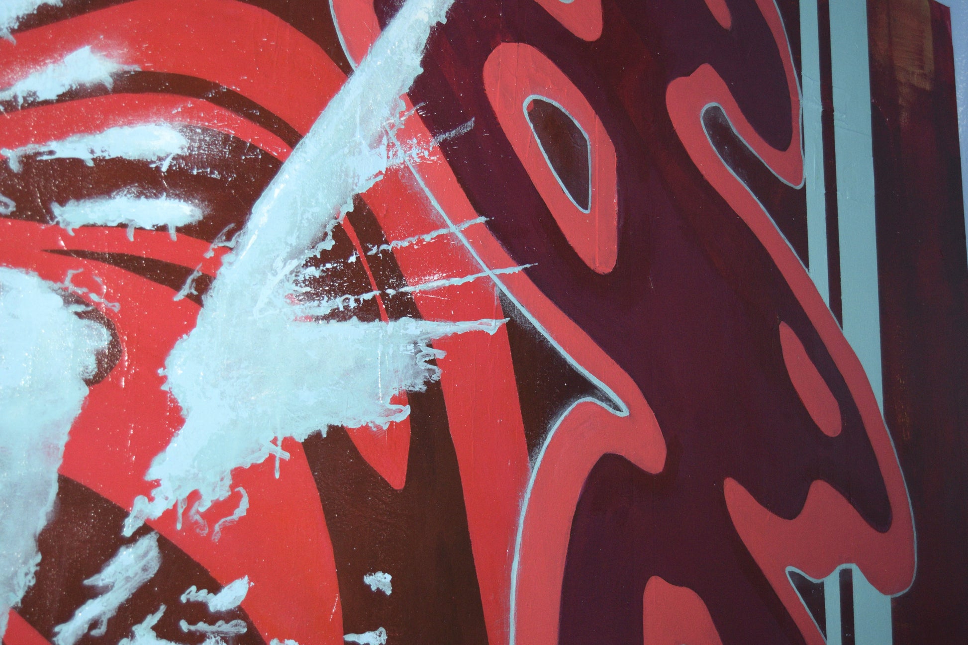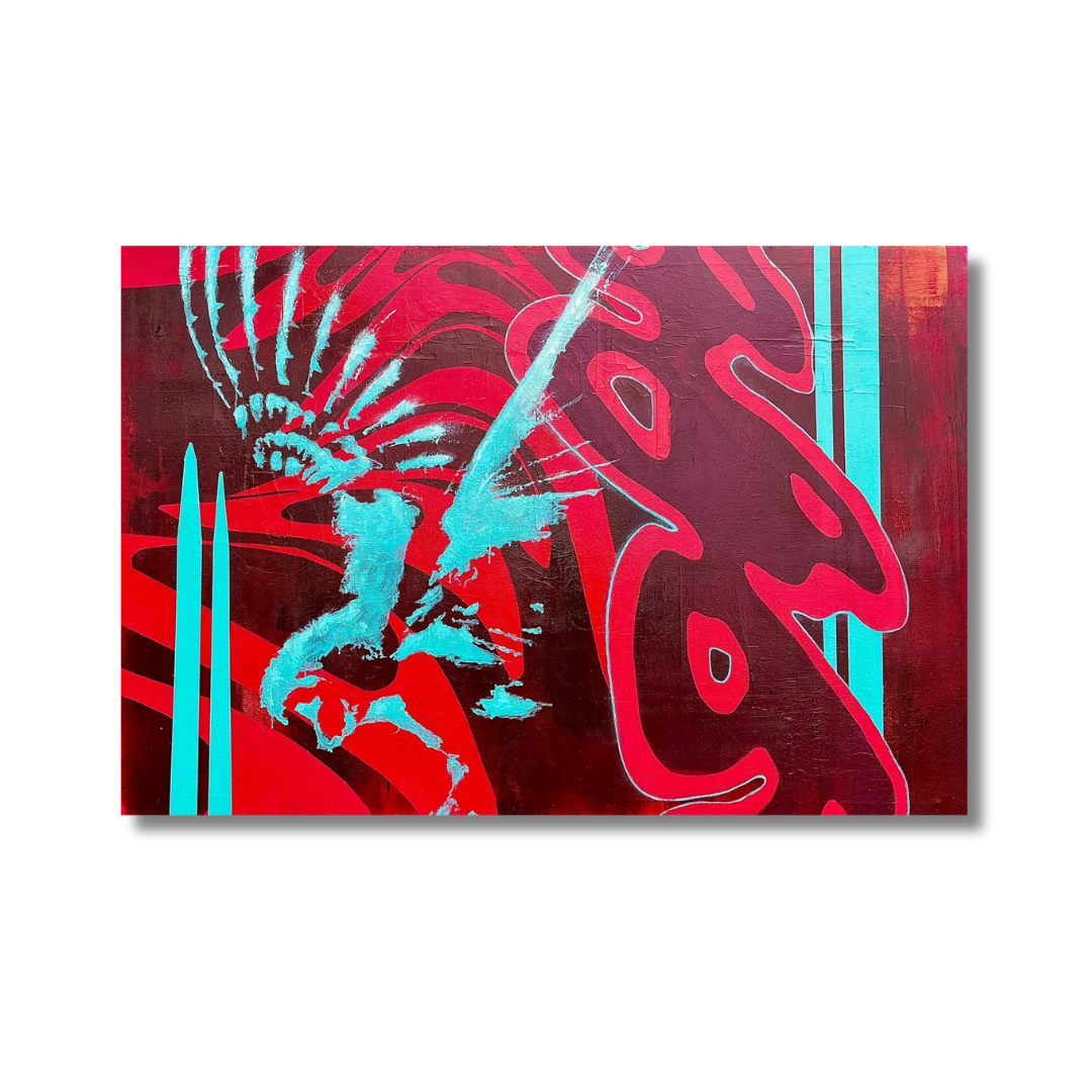 En esta obra, una serie de formas orgánicas distorsionadas en tonos rojizos oscuros se despliegan en el fondo, evocando la textura y profundidad del interior de los órganos, generando una atmósfera íntima y visceral. Sobre este paisaje interno emerge la silueta de un búho en un intenso azul cian, acompañado por dos franjas que simbolizan el cambio y el silencio. El contraste entre la figura del ave y el cuerpo de formas orgánicas crea un diálogo entre lo interior y lo espiritual, entre la quietud y el movimiento implícito del aleteo que se dirige hacia el propio centro.