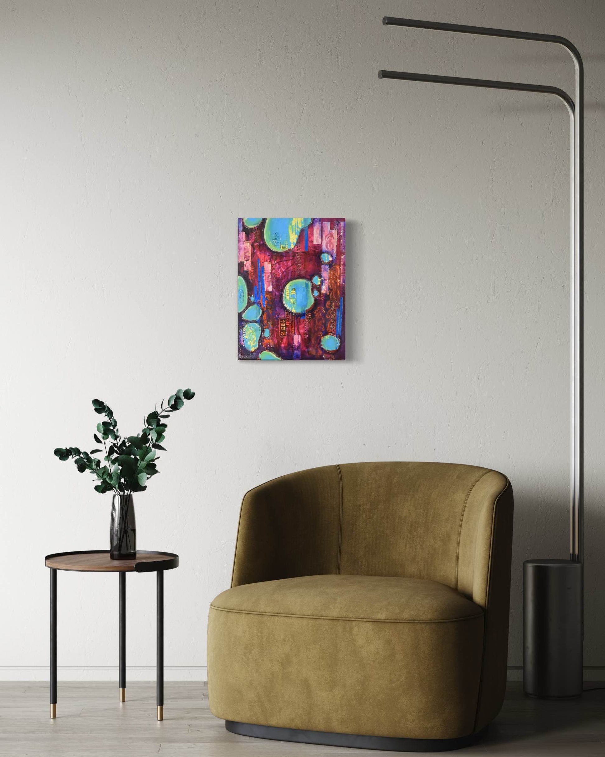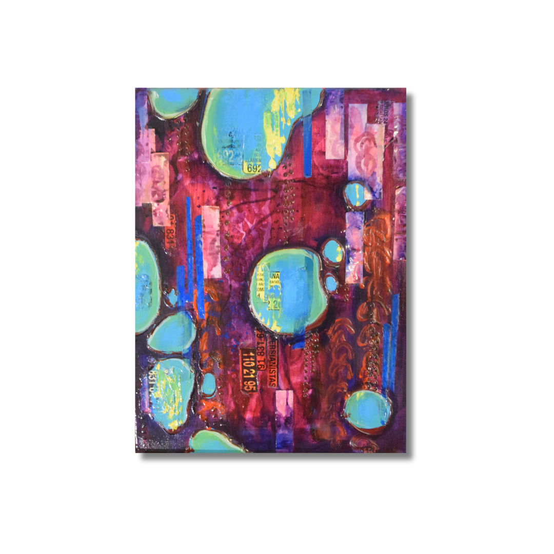*"Descomposición Saturada" captura el proceso de fragmentación y transformación a través de un vibrante contraste de colores y texturas. Un fondo rojo intenso, enriquecido con matices magenta, crea una atmósfera de tensión donde la descomposición se manifiesta visualmente. Sobre esta base, números de teléfono en collage y enredaderas de plantas con forma de ojos se entrelazan, simbolizando el rastro de la memoria urbana y la presencia constante de la mirada ajena. De este fondo emergen fisuras irregulares, abriendo paso a un cian claro contaminado por manchas de amarillo saturado, como si la propia superficie estuviera mutando y revelando capas ocultas de significado."