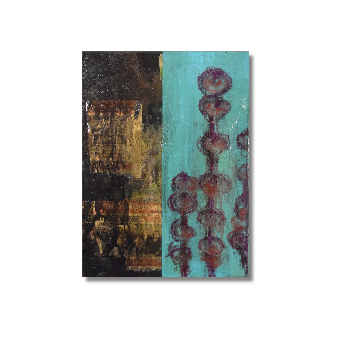 *"Dos Caras" refleja la tendencia humana a descartar lo ya utilizado en busca de nuevas oportunidades. La composición se divide en dos mitades contrastantes: en el lado izquierdo, tonos ocres oscuros y un collage de recortes de periódicos empresariales simbolizan lo que ha sido explotado y relegado al olvido, representando el desgaste de ideas, estructuras y personas en el ciclo implacable de la vida metropolitana. En contraste, el lado derecho se abre a un fondo plano cian, donde emergen ramas de ojos que miran hacia el futuro, encarnando la atracción por lo nuevo, lo inexplorado y las promesas de un horizonte aún por descubrir."